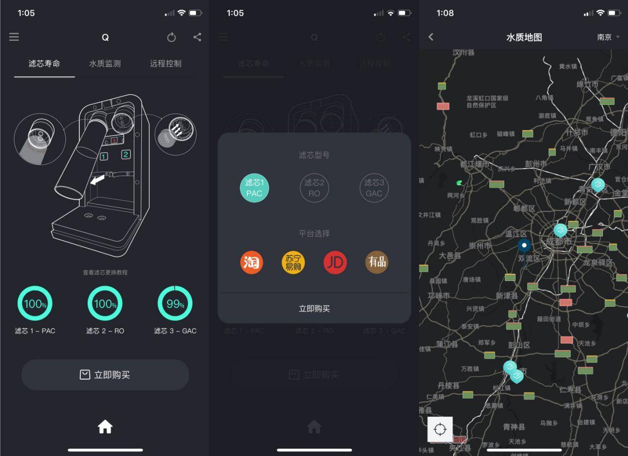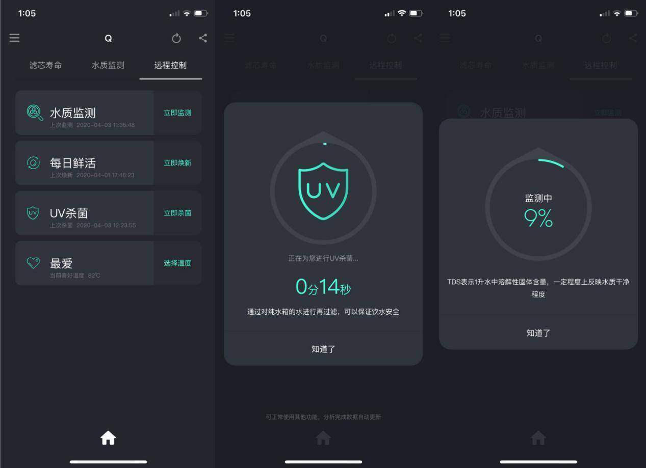 當然水質檢測、UV殺菌、每日鮮活等功能也是可以遠程實現的。人還在回家的路上,一杯鮮活的純凈水已經制好待飲。