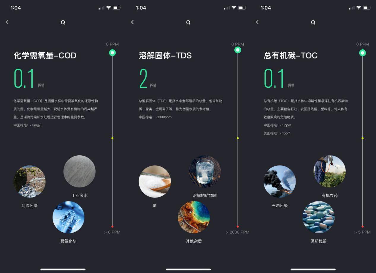 的觸控操作面板設計直觀簡約,并且主要觸控功能鍵圍繞圓周分布,使用也很方便。開啟水質檢測功能,每次取水都能直觀看到水中的TOC、COD、TDS值以及水溫;手機APP端還能詳細了解各項指標的意義,這點也很人性化,可以喝得更放心。